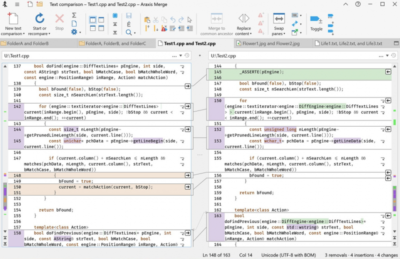 Araxis Merge Professional은 텍스트 파일 및 폴더를 시각적으로 비교, 병합 및 동기화하는 데 도움을 주기 위해 특별히 작성된 소프트웨어 프로그램입니다. Microsoft Office (Word및 Excel), OpenDocument, PDF및 RTF 파일의 텍스트를 직접 열고 비교한다. 다른 애플리케이션 (예: Microsoft Word) 에서 텍스트를 복사하여 텍스트 비교에 직접 붙여넣으십시오.