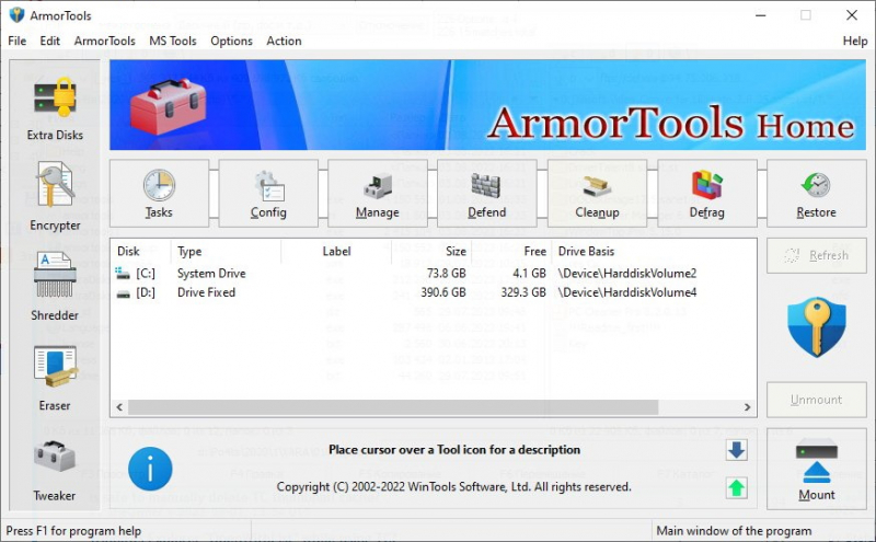 ArmorTools는 컴퓨터에서 사용자 작업의 흔적을 제거하고, 사이트 방문 기록을 지우고, 복구 가능성 없이 기밀 정보를 삭제합니다. 또한 MS Windows 운영 체제에 대한 추가 설정 세트도 있습니다. ArmorTools에는 추가 디스크, 파일 분쇄기, 파일 암호화기, 개체 지우개, 시스템 조정기