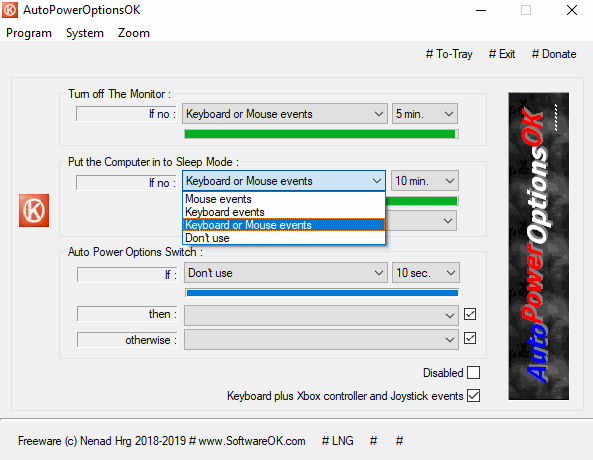 AutoPowerOptionsOK는 자동으로 모니터를 끄고, 컴퓨터를 절전 모드로 전환하거나 전원 관리 모드 간에 전환할 수 있는 작은 프로그램입니다. 지정된 기간 동안 키보드 및/또는 마우스 이벤트가 없을 경우 각 작업이 트리거될 수 있습니다. 예를 들어 마우스나 키보드를 10분 동안 사용하지 않으면 모니터를 자동으로 끌 수 있습니다.