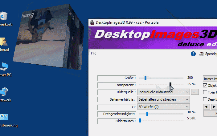 DesktopImages3D 을 사용하면 3D로 데스크탑에 이미지를 표시할 수 있습니다. DesktopImages3D 은 선호하는 이미지를 부동 또는 고정된 3D큐브에 표시하는 재미있는 옵션입니다. 데스크탑 백그라운드를 사용하고 부동 3D큐브의 이미지를 강조표시하는 데 초점을 맞출 수 있습니다. 큐브는 사용자 정의 간격으로 이미지를 회전 및 교환하도록 설정할 수 있습니다. 또한 락킹 큐브나 회전 사각형과 같은 큐브 유형에 대한 사전 설정이 있습니다.