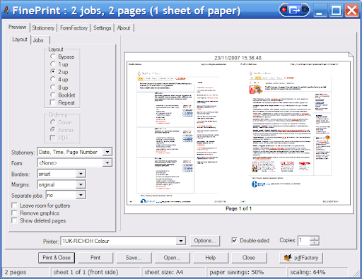 Windows XP, Windows Vista, Windows 7, Windows 8, Windows 10, Windows 11용 파인프린트(FinePrint) 11 다운로드: 인쇄용지를 절약하고 프린터 수명을 연장하여 한 장의 용지에 여러 페이지의 파일을 인쇄합니다.
