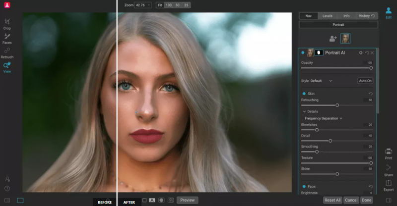 ON1 Portrait AI를 사용하면 클릭 한 번으로 완벽한 리터칭이 가능합니다. 기계 학습을 사용하여 사진 속 모든 얼굴을 찾아 자동으로 멋진 모습으로 만들어줍니다. 각 얼굴을 분석하고 피부, 눈, 입에 적절한 양의 리터칭을 추가하여 전문적인 결과를 즉시 얻을 수 있습니다.