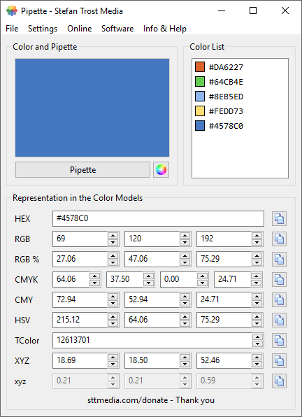 Pipette을 사용하면 화면 어딘가(예: 다른 애플리케이션이나 사진)에서 색상을 선택하여 RGB, CMY, CMYK, HSV, TColor 또는 XYZ와 같은 다양한 색상 모델로 변환할 수 있습니다. 또한 한 색상 모델에서 다른 색상 모델로 색상을 변환하거나 여러 가지 기회를 통해 뉘앙스에 따라 색상을 변경할 수 있습니다.