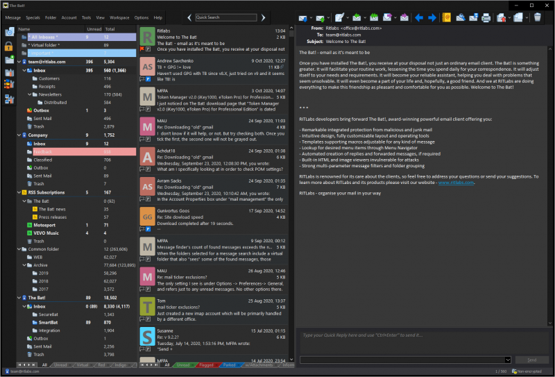 Windows 11, Windows 10, Windows 8, Windows 7용 The Bat! Professional 10 다운로드: 무제한의 메시지와 무제한의 이메일 계정을 처리하고 저장합니다.