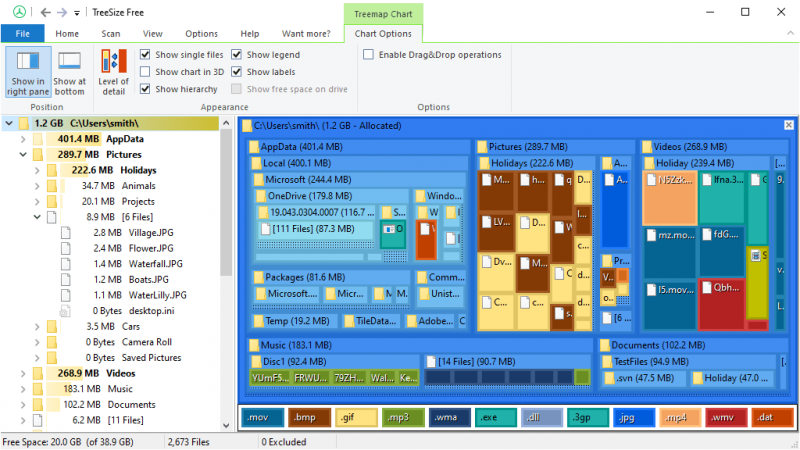 - 사용자 정의 가능한 트리맵 차트를 사용하여 사용한 디스크 공간의 분배를 확인하십시오.