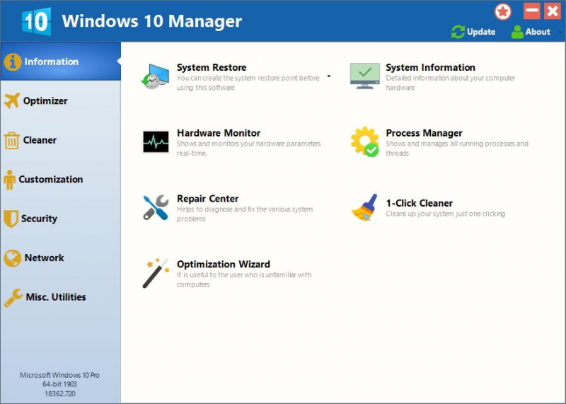 Windows 10 Manager 은 Windows 10을 최적화, 정리 및 수리하는 데 유용한 도구입니다. 이 프로그램은 시스템을 가속화합니다. Windows 에서 발생할 수 있는 수정사항 오류입니다. Windows 10보안 문제를 탐지하고 수정합니다. 이 툴은 전문 사용자들이 원하는 목표를 달성할 수 있는 30개의 다양한 툴들로 구성되어 있다. 옵션을 선택하여 선택할 수 있습니다.